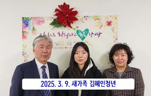 2025.3.9 새가족 김혜인청년 작성자신목교회 등록일 25-03-18 조회359회 이름신목교회 본문 사랑하고 축복합니다. 2025. 4. 20일 새가족 장경철성도 김경숙성도(정연경집사인도) 2025.1.26 새가족 전지웅성도 목록